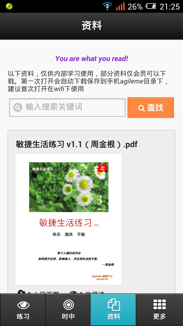 资料下载:敏捷生活练习 v1.1(周金根).pdf 发表于2014年6月13日由周金根 了解敏捷个人的朋友一定知道敏捷生活练习了,现在把这个练习分享给大家,可以前往下载。 提示:手机应用是最新版,电子资料是老版本。 相关文章: 第2期敏捷生活练习本周完成 敏捷生活练习来源于新加坡一个女孩的blog,看后让我对生活有一种新的认识,于是在2011年春节后组织网上各地的敏友进行了一次练习。这次练习让我明白生活是什么,也更清楚了我要什么样的生活。7月份是我进行的第2期线上练习..... 继续阅读 →... PPT:创业中的敏捷个人 本文只限终身会员查看... 资料下载:201104 活出自己的价值(周金根).pdf 在敏捷个人网站 http://www.zhoujingen.cn 首页中的敏捷 … 继续阅读 →... 资料下载:敏捷个人-认识自我,管理自我 v0.8.pdf 从11年敏捷个人电子书v0.2以来,感谢大家的喜欢,这让我开始更疯狂的分享,电子 … 继续阅读 →...