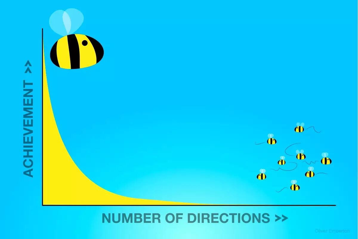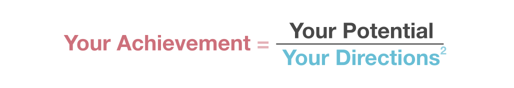 事实上,方向的数量与我们可以取得成就在某种程度上成反比。按照上面的这个公式,每多一个方向将会使你所能达成的成果降到1/4。