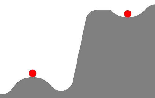 右边的小球是不稳定的,一点点风吹草动就能让它万劫不覆。从左边到右边,它需要付出大量的努力,才能到达现在的这个位置。为了保持住这样的位置,它还必须要持续的输入外部能量来抵抗任何可能的扰动。换言之,它必须枕戈待旦,一直抗争不止,否则,就会从这个位置滑落。